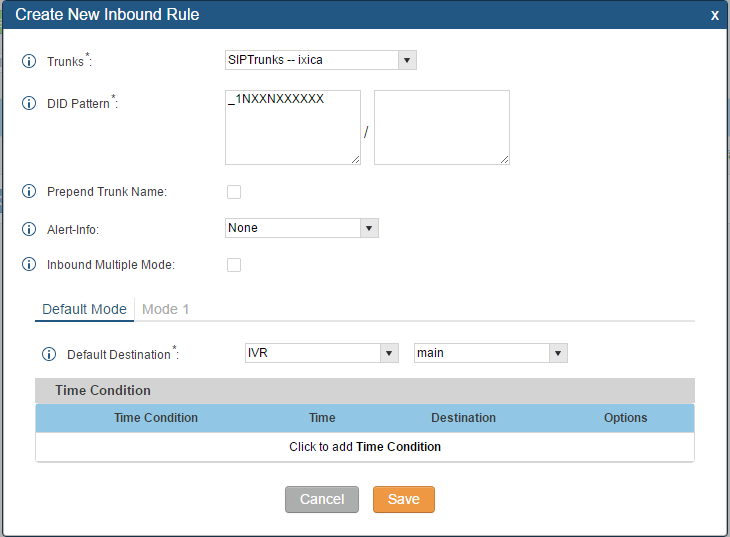 DID Pattern: _1NXXNXXXXXX should be replaced by your DID with a _1 in front of it. So if you DID is 4162734828 then you should put _14162734828 into the DID pattern field. If you have multiple DIDs you should create a separate Inbound Rule for each DID so that you can individually perform call control.