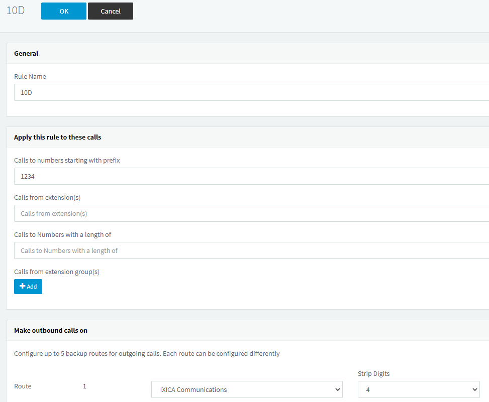 Create the additional SIP trunks identical to Method 1 above for each Company. Then instead of creating Groups, create outbound rules with a prefix and route those calls over the respective SIP Trunk. Please remember to strip the prefix as shown below.